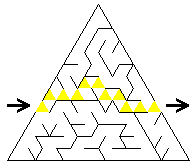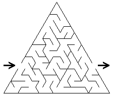 Alle dreieckigen Irrgärten, die dieser Webserver erzeugt, werden über eine eindeutige ID, bestehend aus Kleinbuchstaben, Ziffern sowie den runden, eckigen und geschweiften Klammern und den Zeichen @, $, !, -, _, | und dem Punkt (insgesamt also 49 Zeichen) bestehen, identifiziert. Somit ist es nicht nur möglich, nach bestimmten Vorgaben Irrgärten zu generieren, son- ein einmal generierter Irrgarten kann immer wieder aufgerufen werden und es kann seine Lösung abgefragt werden. Dieser Webserver liefert Irrgärten mit Hilfe der folgenden vier Namen: triangles.html Liefert einen Irrgarten in einer Webseite. triangles.cgi Liefert einen Irrgarten in einer Webseite für Handy/PDA. triangles.pdf Liefert einen Irrgarten zum Ausdrucken in PDF. triangles.png Liefert einen Irrgarten als Graphik. triangles.txt Liefert einen Irrgarten in seiner internen Codierung. triangles.xml Liefert die interne Codierung in einer XML-Struktur. Alle genannten vier Adressen verstehenden die folgenden CGI-Parameter, mit denen sich das Aussehen des Irrgartens bestimmen läßt: data - Mit diesem Parameter läßt sich ein vorgegebener Irrgarten spezi- fizieren. Es handelt sich um die bereits eingangs genannte ID, die sich aus den 49 genannten Zeichen zusammensetzt. Natürlich steht nicht jede ID, die sich aus diesem 49 Zeichen zusammensetzt, für einen sinnvollen Irrgar- garten. Es macht also keinen Sinn, sich so eine Zeichenfolge durch Zufall zu erzeugen. Statt dessen erhält man eine solche ID mit Hilfe der Websei- ten triangles.txt und triangles.xml. Ist dieser Wert der einzige Parameter, so kann er ohne Parameternamen in der URL direkt nach dem Fragezeichen genannt werden, also z.B.: trianges.pdf?g@el@kh|5@@pna59k@31|k26!gagimkdovngbi@3|52k]85kpu222uv({1dw trianges.png?g@el@kh|5@@pna59k@31|k26!gagimkdovngbi@3|52k]85kpu222uv({1dw lines - Dieser Parameter wird verwendet, wenn der Parameter data nicht angegeben wird, also ein neuer Irrgarten generiert werden soll. Er enthält eine Maßzahl für die Höhe des Dreiecks (Anzahl Zeilen). Es können Zahlen zwischen 12 und 80 angegeben werden. Wird kein Wert angegeben, so wird eine beliebige Höhe zufällig ermittelt. Beispiel: trianges.xml?lines=24 straight- Bei der Neugenerierung eines Irrgarten kann mit diesem Parameter bestimmt werden, wie stark geradlinige Wege bevorzugt werden sollen. Die Angabe erfolgt mit Hilfe einer Zahl. Dabei steht 0 dafür, daß gerade Ver- bindungen möglichst vermieden werden, der Wert 1 für keine besondere Be- rücksichtigung gerader Verbindungen und alle höheren Zahlen für eine je nach Zahlenwert unterschiedlich starke Bevorzugung geradliniger Wege. Beispiel: triangles.pdf?lines=80&straight=0 Beispiel: triangles.html?lines=32&straight=80 solve - Mit diesem Parameter wird bestimmt, ob auch die Lösung angezeigt werden soll. Wird der Parameter weggelassen und leer übergeben, so wird keine Lösung berechnet. Wird der Parameter mit irgendeinem nicht leeren Inhalt belegt, so wird die Lösung des Irrgartens ermittelt. Beispiel: trianges.png?solve=loesen&data=8p@pm5g@4p5b2dhey@31ma@kk2n84oudrdoolru Man kann sich also z.B. mit Hilfe der Webseite triangles.txt und bestimm- ten Werten für die Parameter lines und straight die interne ID eines Irr- garten errechnen lassen. Übergibt man diese ID als Parameter data der Ad- dresse triangles.png, so erhält man die Graphik des Irrgartens und mit dem zusätzlichen Paramater solve dann auch die Lösung.